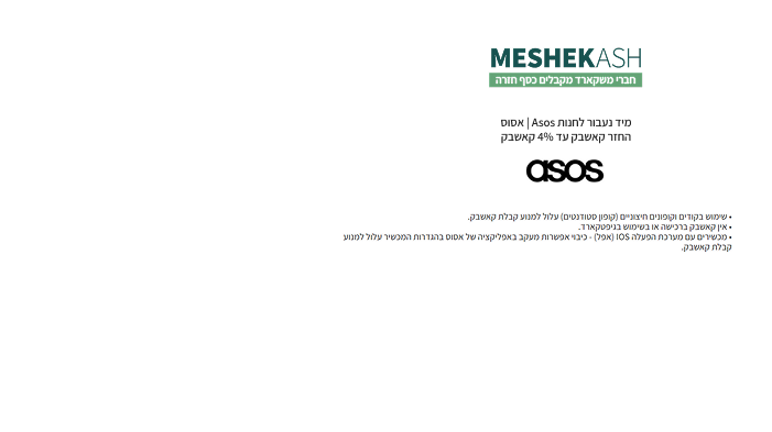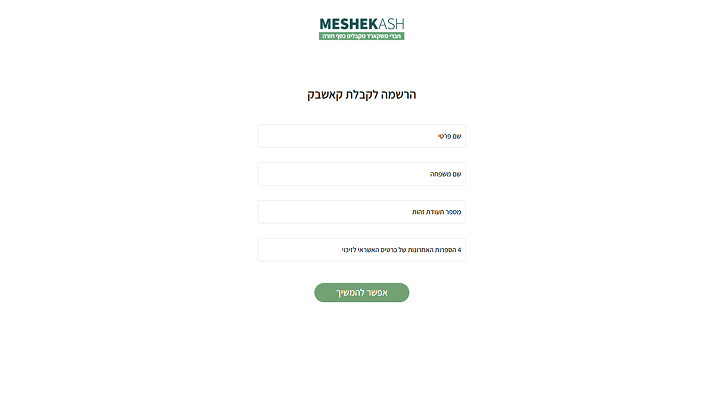- בכדי שנוכל לזכות אתכם בקאשבק, חשוב שתהליך הקנייה יתחיל באתר Meshekash רק כך נוכל לוודא שתקבלו את ההחזר הכספי לו אתם זכאים.